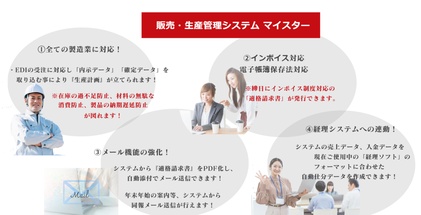 ・EDI確定受注取込 | ・生産計画 | ・適格請求書発行 | ・構成品マスタ | |